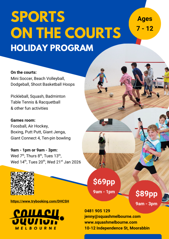 Squash Melbourne run a school holiday program for kids to try a variety of sports and games while having fun.