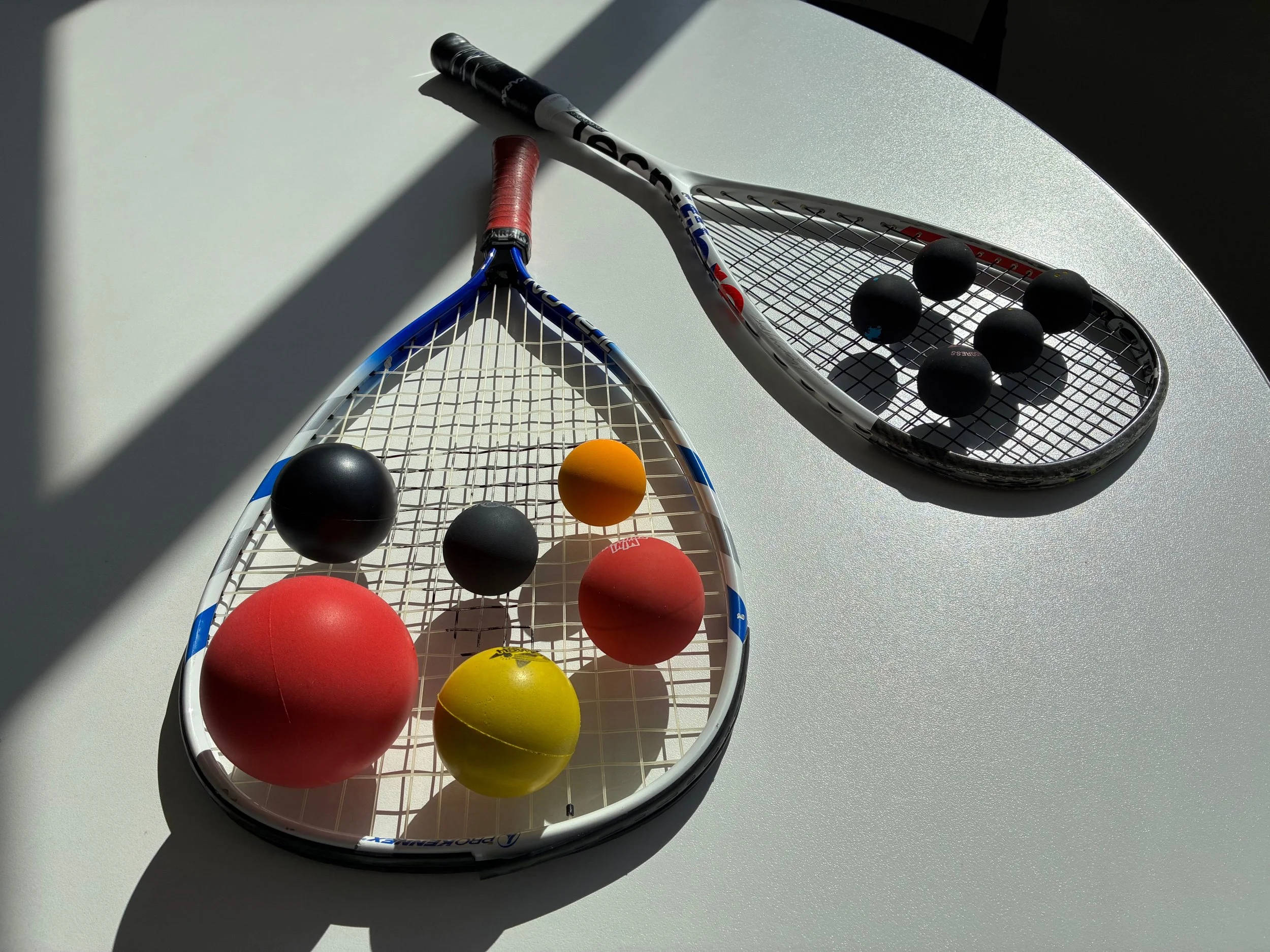 e.g. Novices use a large, low compression ball and a racquetball racquet.